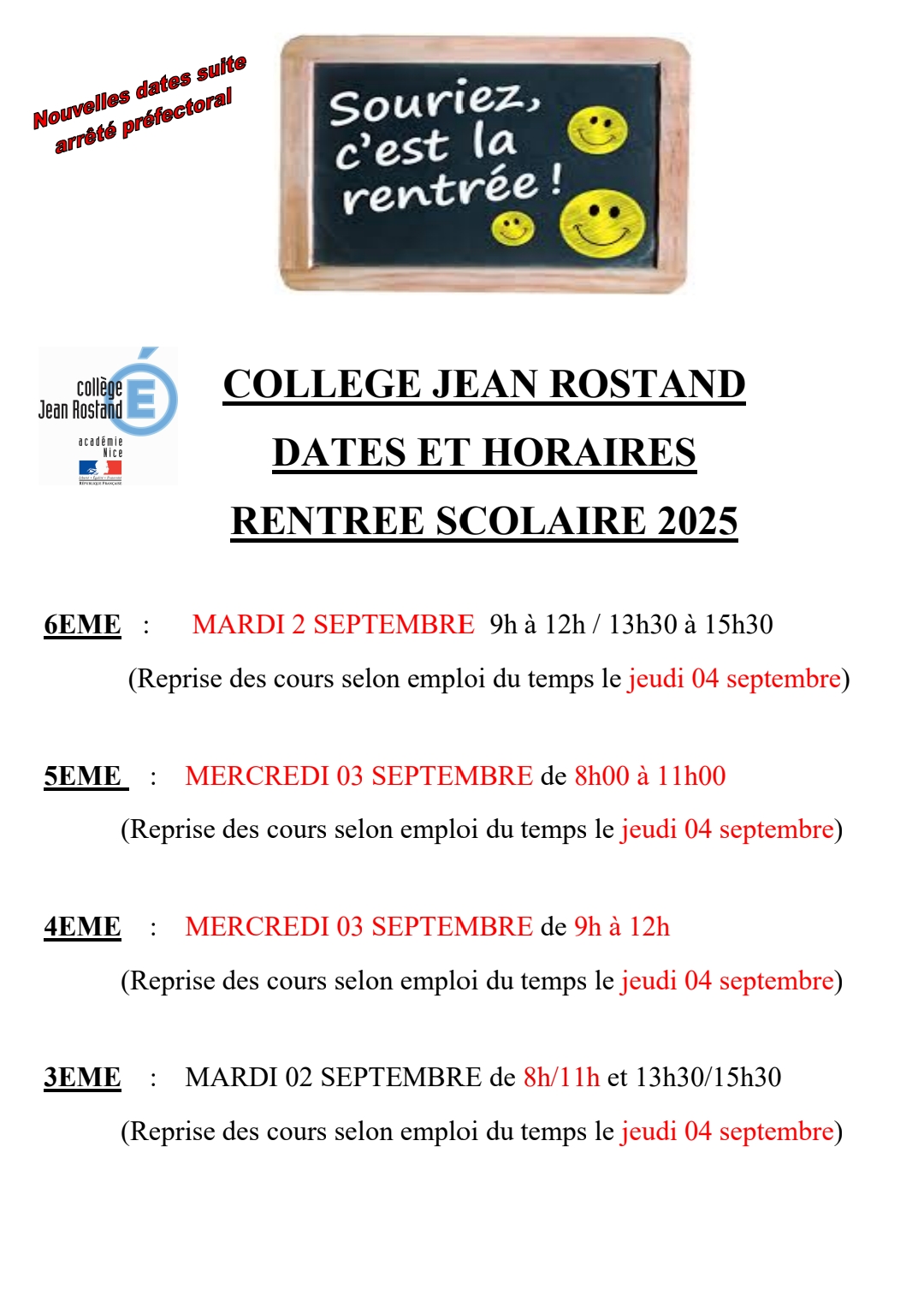 Suite à l'arrêté préfectoral, voici les nouvelles dates de rentrée.